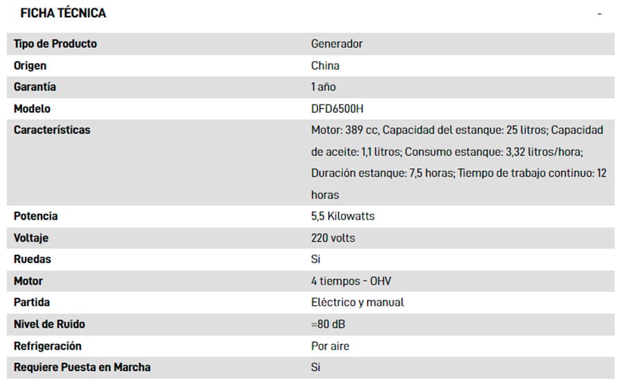 El generador DUCAR DF6500H bencinero de 389 cc es un equipo de ferretería de un cilindro, 4 tiempos, con refrigeración por aire, OHV. Por ende, es capaz de dar carga a diversidad de baterías. El tamaño y la portabilidad de este equipo lo hacen ideal para cualquier tipo de ocasión donde se necesite energía eléctrica. La sencillez del DF6500H permite que cualquier usuario lo opere con facilidad, ya que todo lo necesario es encender y tomar lecturas sobre el voltaje que se encuentra al frente del generador. La instalación es sumamente simple, solo se debe ubicar el generador en una superfi cie pareja y el equipo está listo para operar. El mango hergonómico permite una excelente adherencia al manejo manual. Su enchufe industrial permite conectarlo sin la necesidad de un adaptador. El estanque dura 4 horas apropiadamente, posteriormente se recomienda dejar el equipo descansar por 15 minutos antes de encenderlo nuevamente.