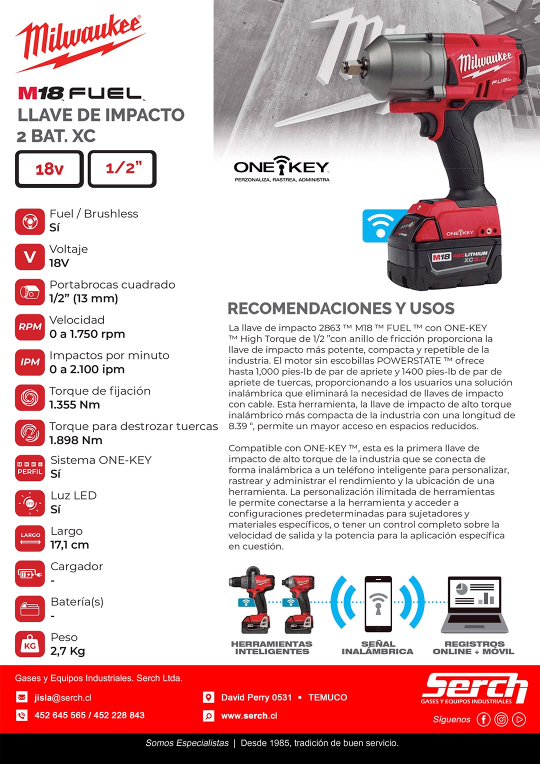 La llave de impacto 2863™ M18™ FUEL™ con ONE-KEY™ de alto torque de 1/2″ posee un anillo de fricción que la hace una de las llaves más potente, más compacta y más repetible de la industria. El motor sin escobillas POWERSTATE™ ofrece hasta 1,000 pies-lbs de torque de apriete y 1400pies-lbs de torque antichispas, proporcionando a los usuarios una solución inalámbrica que eliminará la necesidad de llaves de impacto con cable. Esta herramiemta tiene una longitud de 8.39″, lo que le permite un mayor acceso en espacios reducidos. Compatible con ONE-KEY™, esta es la primera llave de impacto de la industria que se conecta de forma inalámbrica a un teléfono inteligente para personalizar, seguir y administrar el rendimiento y la ubicación de una herramienta. Integrated Tool Security proporciona la máxima protección contra robos. Proteja su inversión con funciones como bloqueo de herramientas u oculte la herramienta de la pantalla de dispositivos cercanos para que solo pueda ver que su herramienta se encuentra dentro del alcance. Si pierde o le roban su herramienta, inutilícela enviando un comando remoto a la herramienta para que se apague la próxima vez que esté dentro del alcance de cualquier aplicación ONE-KEY™. Porta brocas cuadrado: 1/2″ (13 mm). Batería: M18.Fuente de alimentación: Inalámbrica.Incluye 2 baterías 18V 5.0 Ah + Cargador + Maleta.