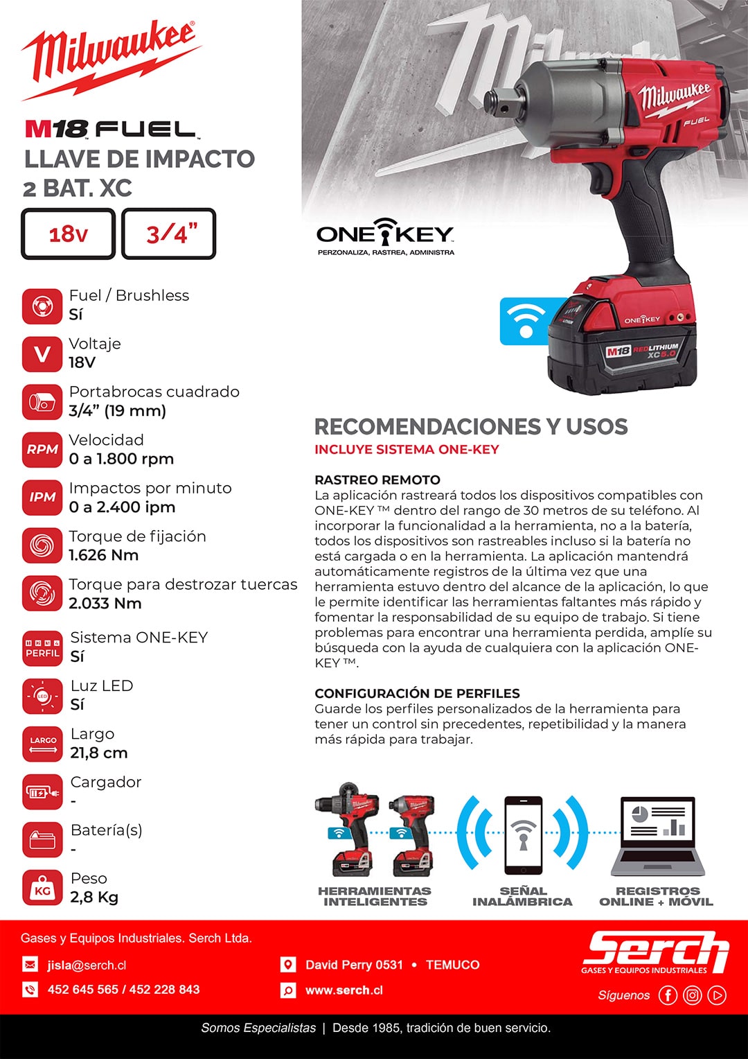 El motor sin escobillas POWERSTATE ™ con el torque más compacto más repetible y compacto de hasta 1500 ft-lbs ofrece hasta 1200 ft-lbs de torsión de cierre y 1500ft-lbs del torque para destrozar tuercas. La llave de impacto de alto torque más compacta y sin cables de su clase con 8.59 » de longitud. Compatible con ONE-KEY ™: personalice, rastree y administre el rendimiento y la ubicación de la herramienta M18 FUEL con la tecnología ONEKEY ™ proporciona la llave de impacto más repetible del sector. Alterne fácilmente hasta cuatro perfiles de rendimiento personalizados que pueden guardarse en la memoria de la herramienta. Cuenta con un anillo de fricción con un diseño de orificio pasante para garantizar un cambio rápido y fácil de los enchufes. Voltaje 18V. Largo 8.59 « Par de apriete 0-1,200 ft-lbs. Torque que revienta la tuerca 0-1,500 ft-lbs. Control de la unidad de 4 modos personalizable. Sin carga IPM 0-2,400. Baterías compatibles con todos los paquetes de baterías M18. Cargadores compatibles con todos los cargadores M18. Compatible con ONE-KEY™: Personalice, rastree y administre el rendimiento y la ubicación de la herramienta. El sobremoldeado de goma de primera calidad soporta los materiales corrosivos y proporciona una mayor comodidad de uso.