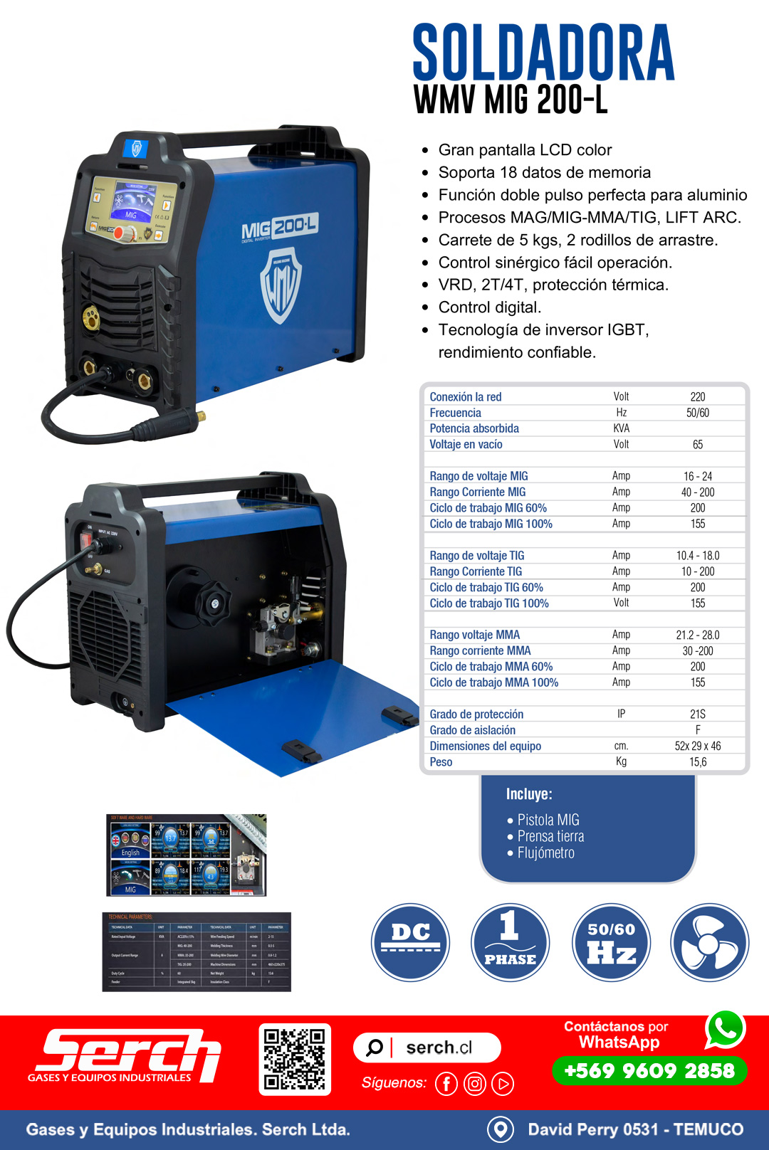 Incluye sistema PULSE y con el pedal externo se puede regular el amperaje sin tocar el panel. Puede soldar electrodos 3/32 y 1/8, acero al carbono, acero inoxidable, aluminio y de mantención; además de aportes TIG 1/16 y 3/32.